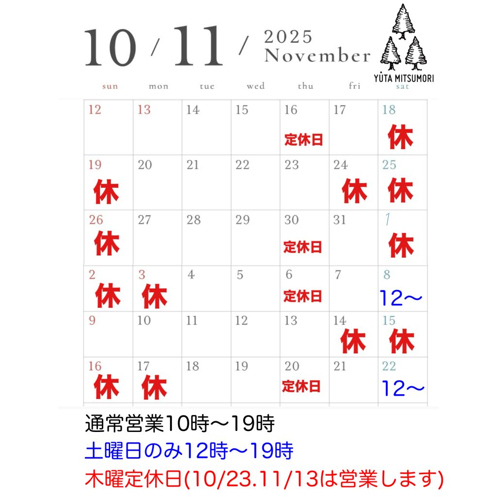 その他はいつも通り、木曜定休日土曜日のみ12時から19時、その他は10時から19時まで営業いたします。
